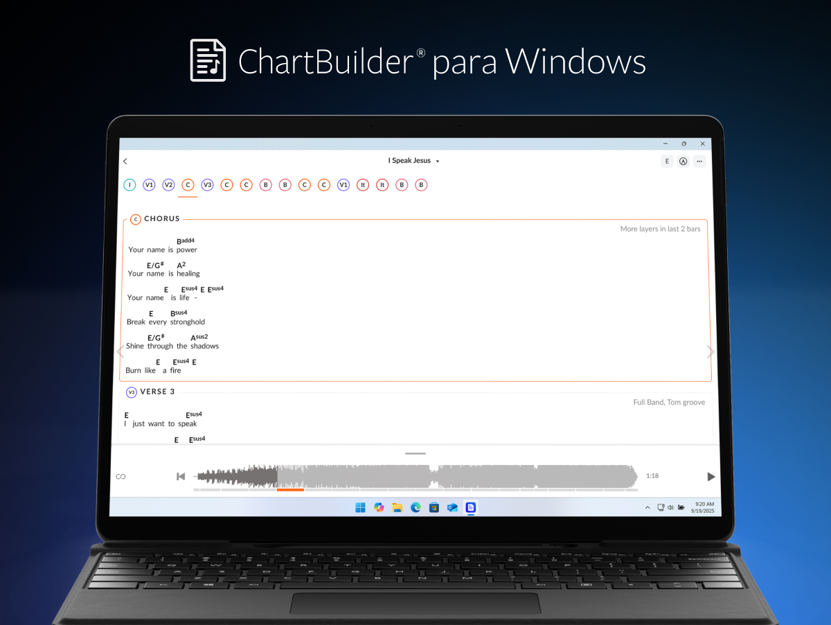 Ahora, tanto si utilizas iOS, Android o Windows, ChartBuilder está disponible para ti en la App Store, Microsoft Store y Google Play. Independientemente del tipo de dispositivo que utilices, puedes crear tus repertorios, ensayar con confianza y mantenerte sincronizado con tu equipo.